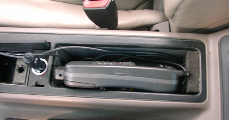 | Die billigere Variante ist es natuerlich, den Communicator einfach in irgendeine Ablage zu legen und mit Strom und GPS zu verbinden. Da die Warnung vor z.B. Radarfallen akustisch erfolgt, muss das Display fuer den Fahrer nicht einsehbar sein. Telefonieren darf man so natuerlich nicht am Steuer, schon garnicht mit dem seriellen Kabel und allem dran :)) | ![]() 9000 mit Kabeln in Ablage, allerdings ohne Strom, den bekommt das GPS. |