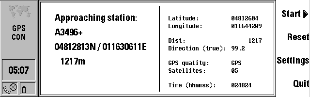 Der Anwendungsschirm ist zweigeteilt, links sind Angaben zum naechstgelegenen Datenbankobjekt (ID, Position, Entfernung), rechts Angaben zur aktuellen Position/Bewgungsrichtung/GPS-Empfangsqualitaet. An diesem Layout wird noch Detailgefeilt, wie man z.B. daran sehen kann, dass die Entfernung derzeit auf beiden Haelften dargestellt wird :) Im Menue kann ueber den Start Button das SMS-versenden aktiviert werden, Reset setzt die Applikation zurueck falls sich was im GPS-Empfang verfressen hat (kommt eigentlich nicht mehr vor), und ueber Settings kommt man zu den Einstellungen fuer SMS-Zentrale, SMS-Zielnummer, SMS-Interval und Interval fuer das Loggen der Position. Hier kommen noch Einstellungen fuer die Positionsdatenbank hinzu, wie Distanz in der gewarnt werden soll, suchverfahren (rundum/in Fahrtrichtung/aus) und u.U. noch andere Parameter. Quit verlaesst die Applikation, ach was. Ist zu empfehlen wenn man sie nicht mehr verwendet, da sie ansonsten natuerlich auch im Hintergrund wenn man andere Programme verwendet und auch bei geschlossenem Geraet weiterlaeuft.